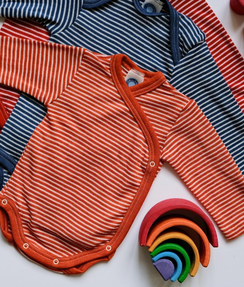 Cosilana omslagsbody i økologisk ull/silke med klassiske striper. Dette er en ekstra fin og myk kvalitet som er fin for sensitiv babyhud. Knapper hele veien foran gjør at bodyen kan taes på uten å dras over hodet. Dette er særlig en fordel når babyene er små. Laget av 70% økologisk merinoull og 30% mulberry silke. GOTS-sertifisert. Kan vaskes på maskin ullprogram 30 grader med vaskemiddel for ull/silke.