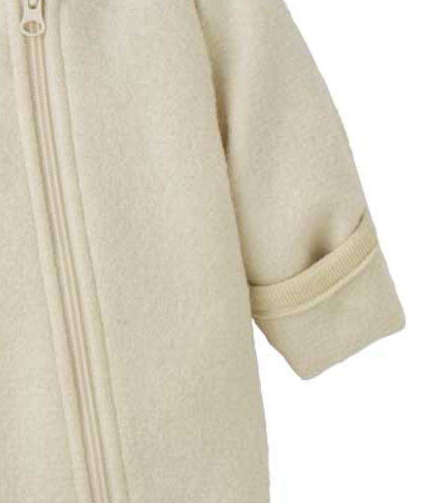 Tykk og deilig ulldress i 100% kokt økologisk merinoull fra Disana til de minste. Praktisk med glidelås, hette og trylle ermer og føtter som kan brettes over og varme små fingre og tær.