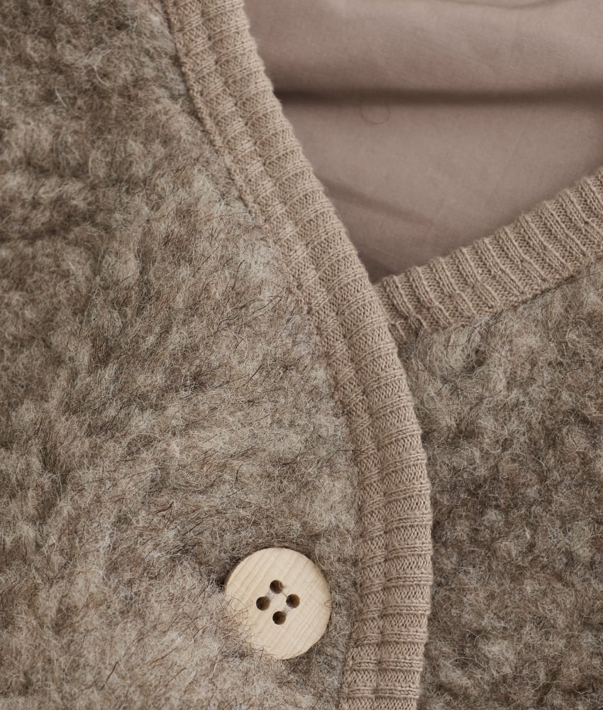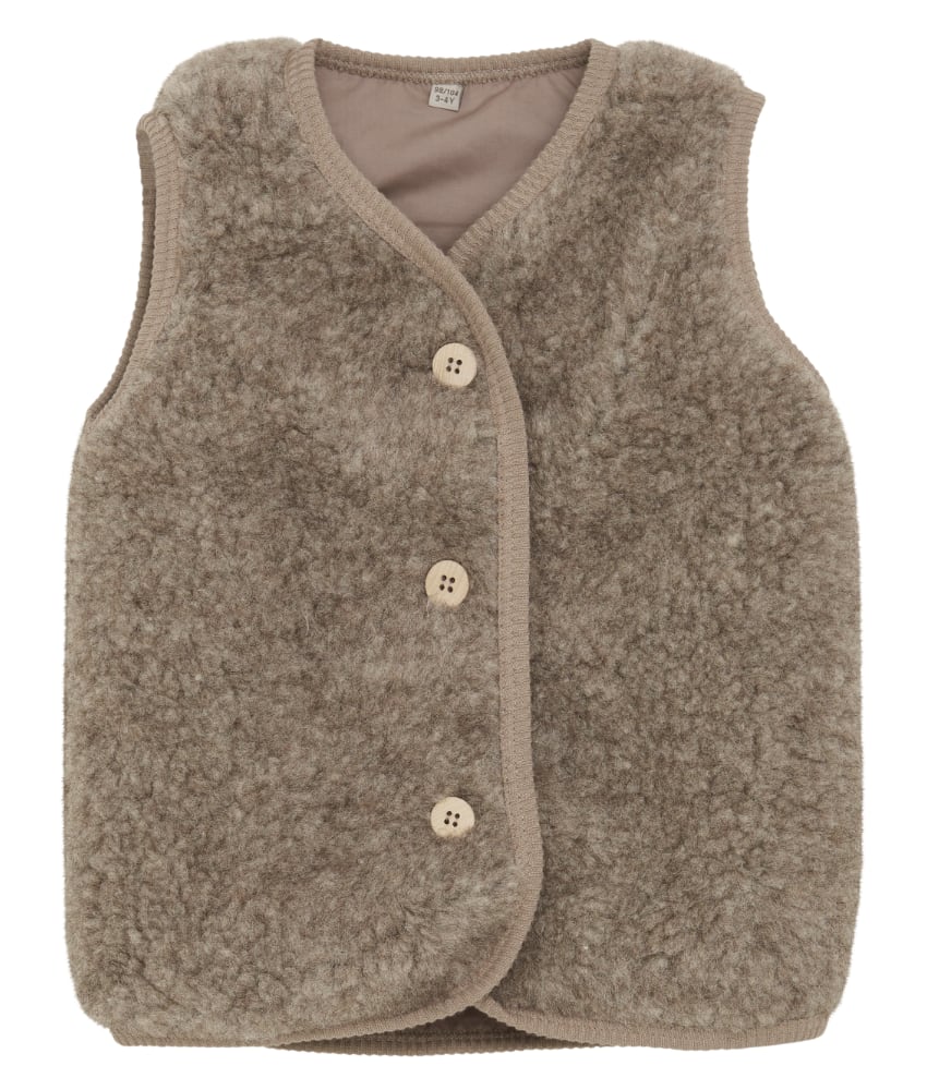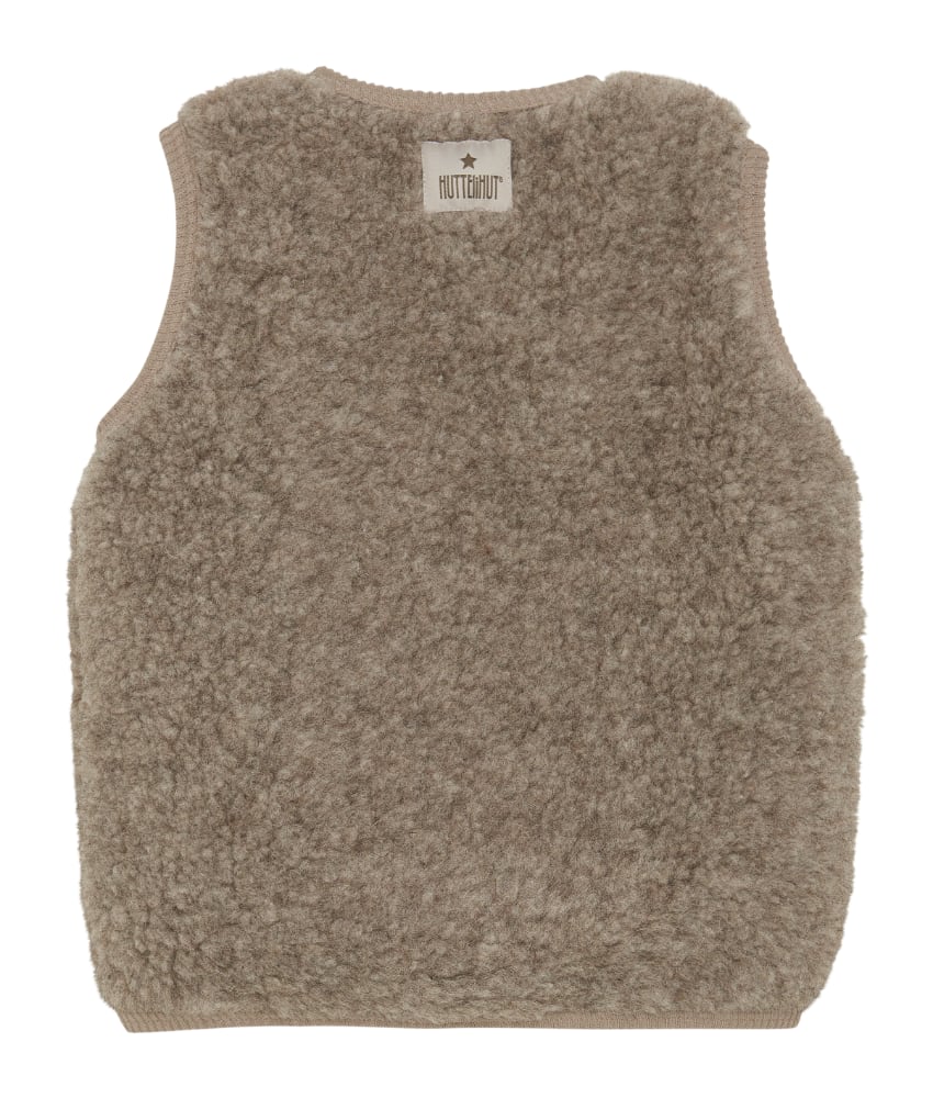Søt og varm teddy vest fra danske HUTTEliHUT laget av 100% merinoull i teddy-tekstur på utsiden og foret med bomull. Vesten har en fin V-hals som åpnes og lukkes foran med knapper. Perfekt å bruke som et lag over en genser for ekstra varme. Vaskes fint på 30 grader ullprogram med vaskemiddel for ull/silke. Tørkes flatt.