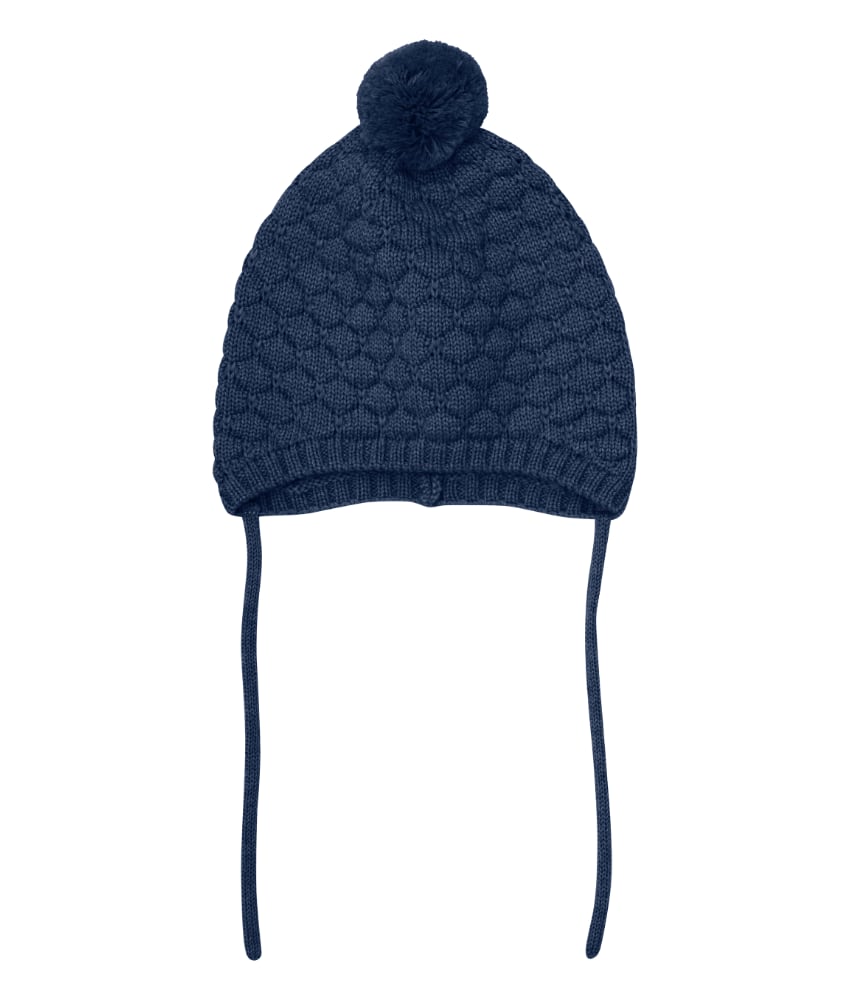 Søt HUTTEliHUT lue med mønster i strikken som gjør at den luner ekstra godt. Luen har en rund hodeform, noe som gir den et fint klassisk utseende med søte detaljer og en dusk på toppen. HUTTEliHUT luen har knyting rundt haken, noe som sikrer en god passform. Luen er strikket i luksuriøs og komfortabel 100% merinoull. Kan vaskes på 30 grader ullprogram med vaskemiddel for ull/silke. Sertifisert med OEKO-TEX® Standard 100 & Woolmark Pure New Wool.