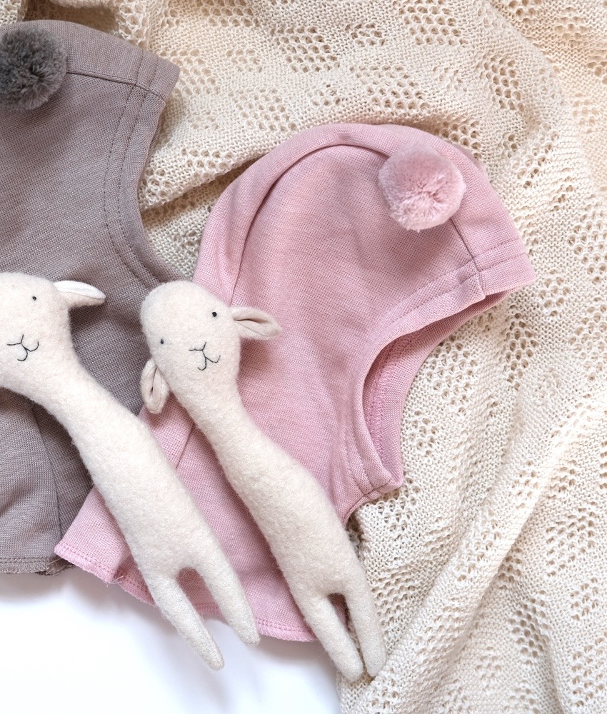 KIVAT balaclava med dusker i ull/silke lyserosa