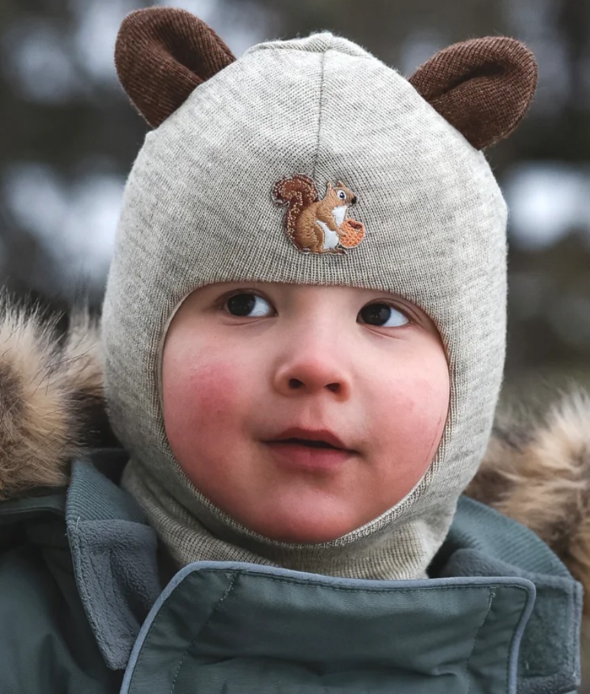 Varm og vindtett balaclava med ekorn-ører og ekorn-logo fra finske Kivat. Luen er strikket i 100% fin ull og foret med GOTS- sertifisert økologisk bomull. Luen har ekstra padding rundt ører og panne. Dette er en lue som du kan føle deg trygg på at barnet ikke blir kald i. Luen er slitesterk og kan fint kan gå i arv og varme flere. Laget i Finland.