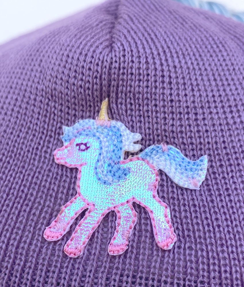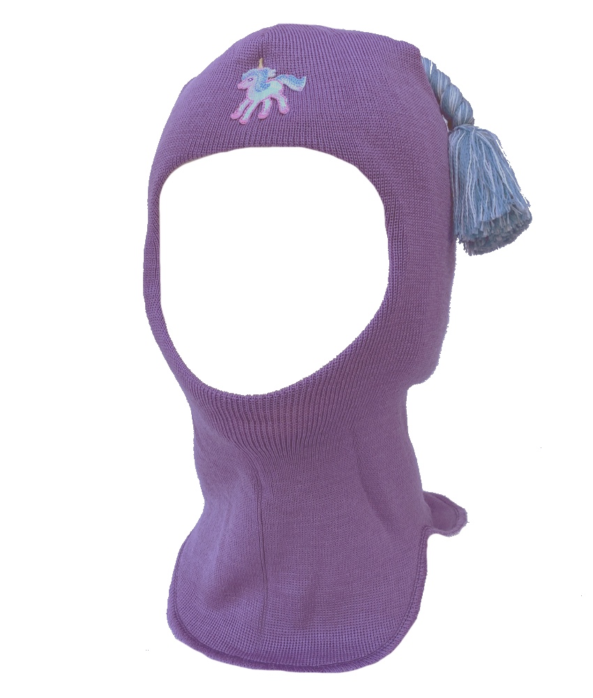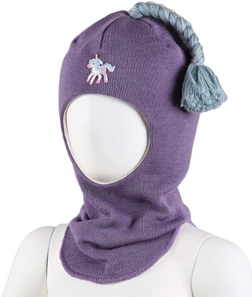 KIVAT foret balaclava i ull med enhjørning og flette lavendel