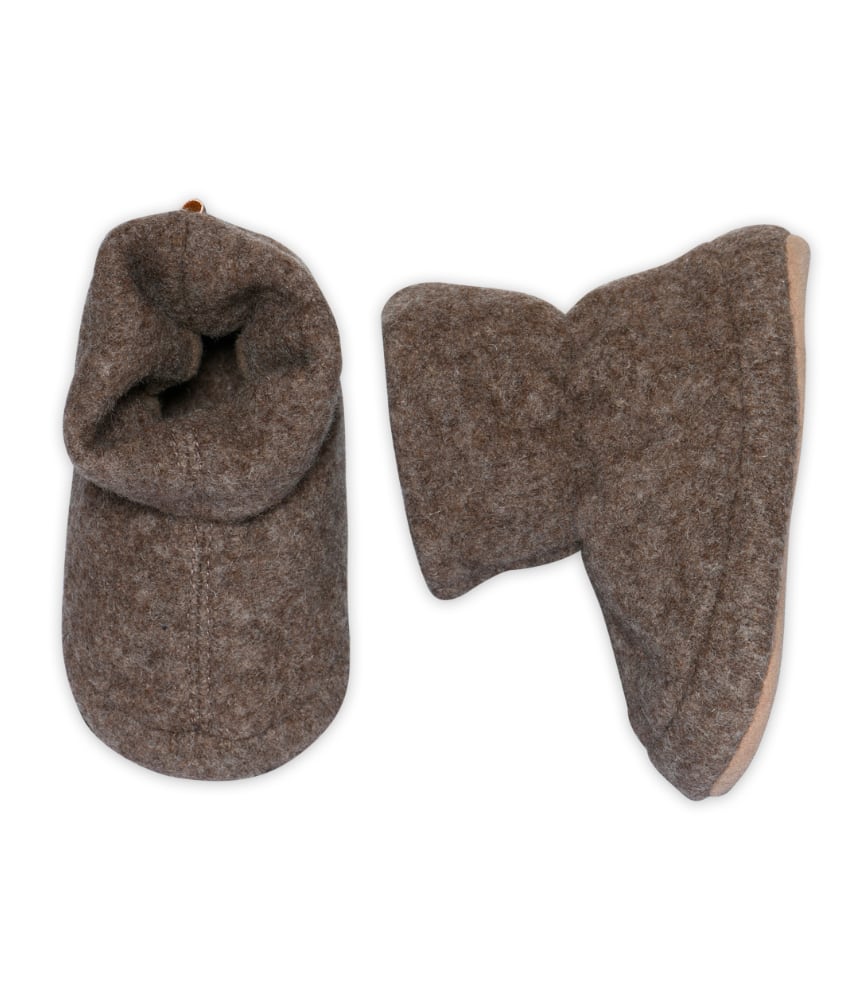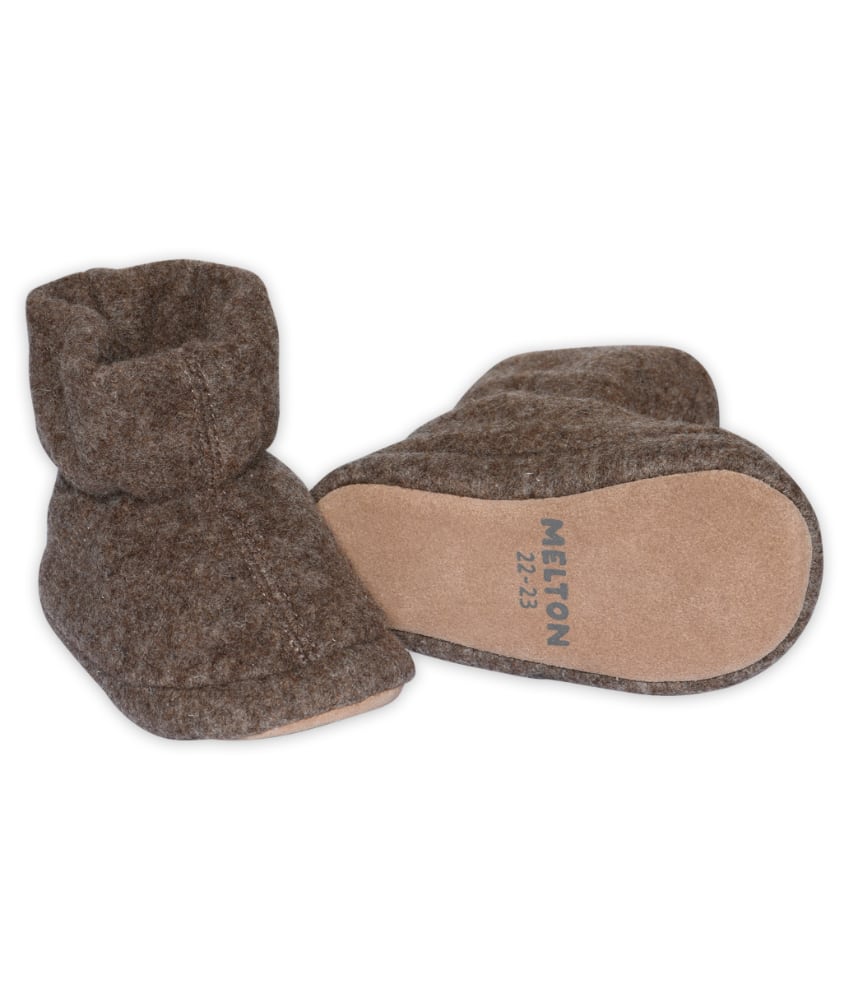 Myke, varme og praktiske ulltøfler fra danske Melton. Overdelen og sålen inni er laget av 100% myk tovet ull. Undersiden er laget av 100% semsket skinn som gjør at føttene får godt feste. Tøflene har en elastisk åpning som gjør det lett for barnet å ta de av og på seg. Disse kan brukes både til de minste i f.eks bilstol, bæresele eller til de litt litt større som tøfler i barnehagen.
