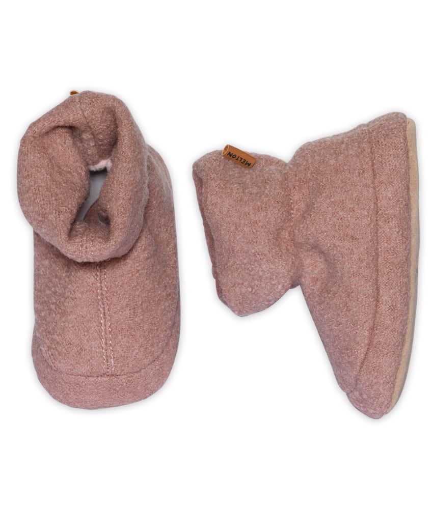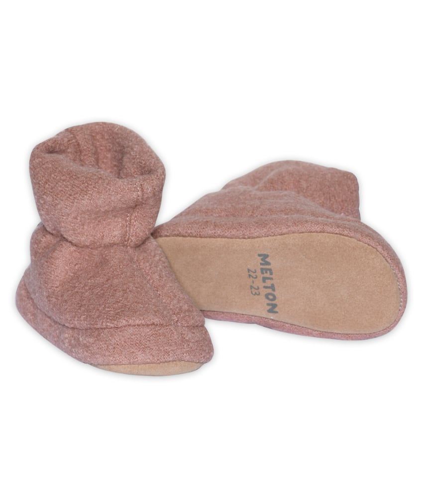 Myke, varme og praktiske ulltøfler fra danske Melton. Overdelen og sålen inni er laget av 100% myk tovet ull. Undersiden er laget av 100% semsket skinn som gjør at føttene får godt feste. Tøflene har en elastisk åpning som gjør det lett for barnet å ta de av og på seg. Disse kan brukes både til de minste i f.eks bilstol, bæresele eller til de litt litt større som tøfler i barnehagen.