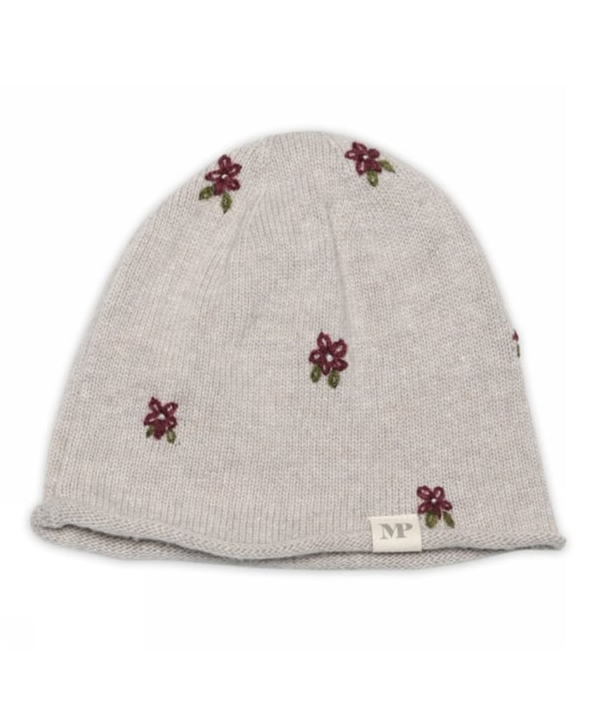 Søt og myk strikkelue fra mp Denmark med blomster. Luen er laget i en myk blanding av 35% polyamid, 30% viskose, 30% merinoull og 5% kashmir.