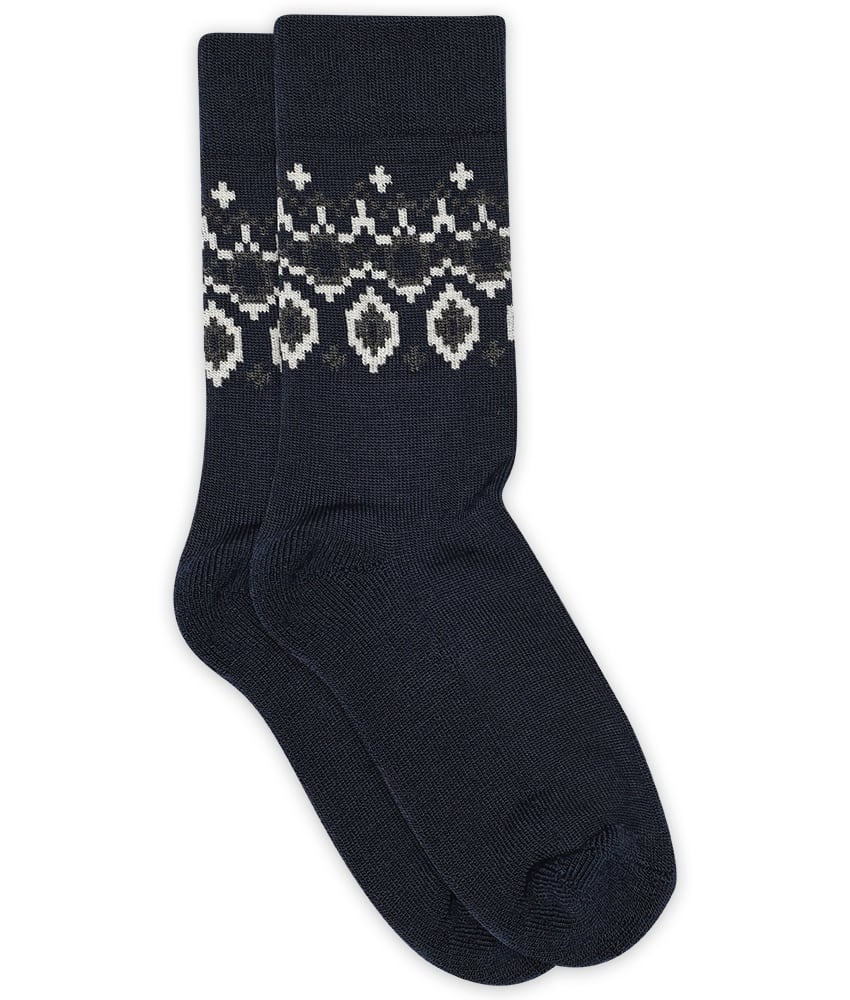 Sokker fra mp Denmark med mønster rundt ankelen. Laget av 80% ull, 17% polyamid og 3% elastan. Vaskes på ullprogram i vaskemaskinen med vaskemiddel for ull/silke. Det anbefales å vaske sokkene på vrangen, så holder de seg fine lengre. Sertifisert med Standard 100 fra OEKO-TEX®.