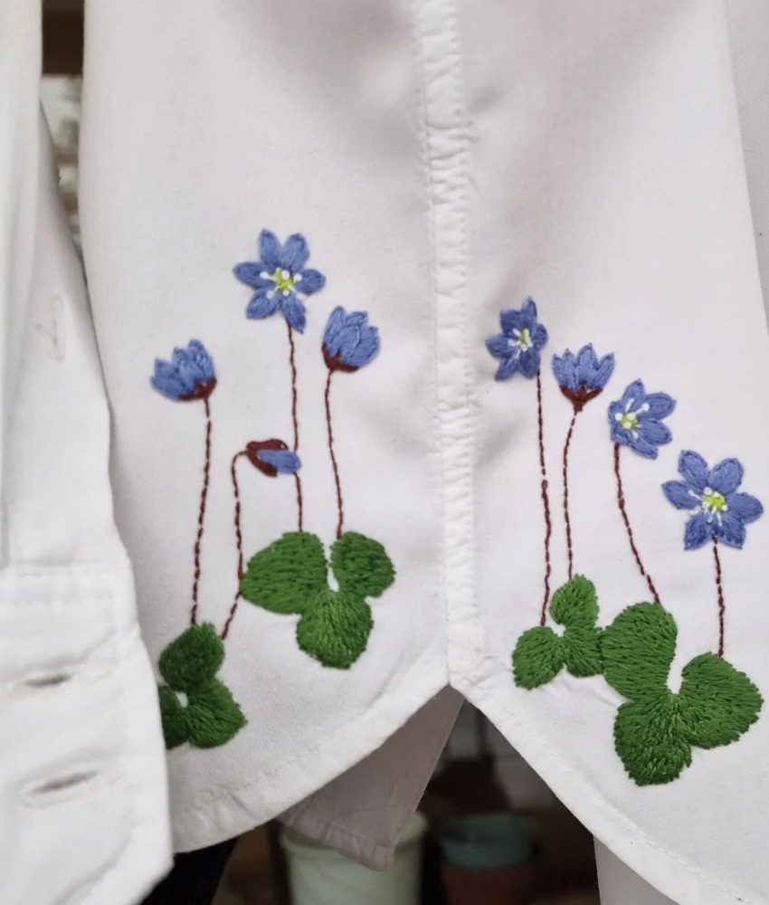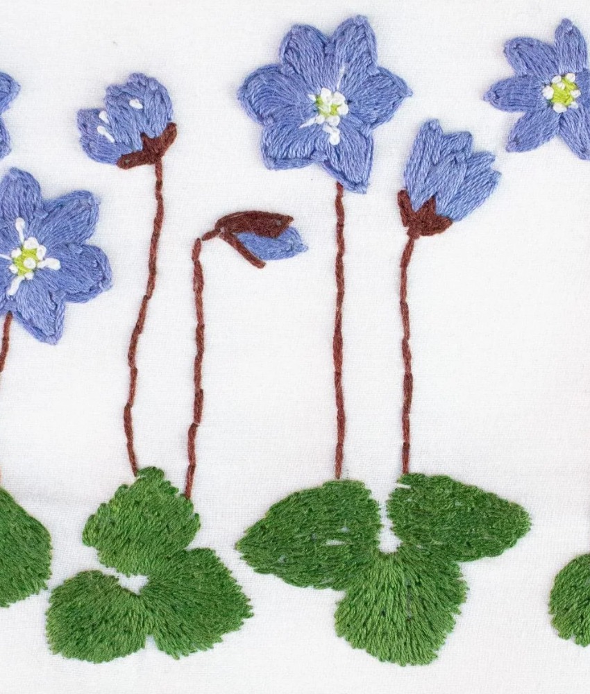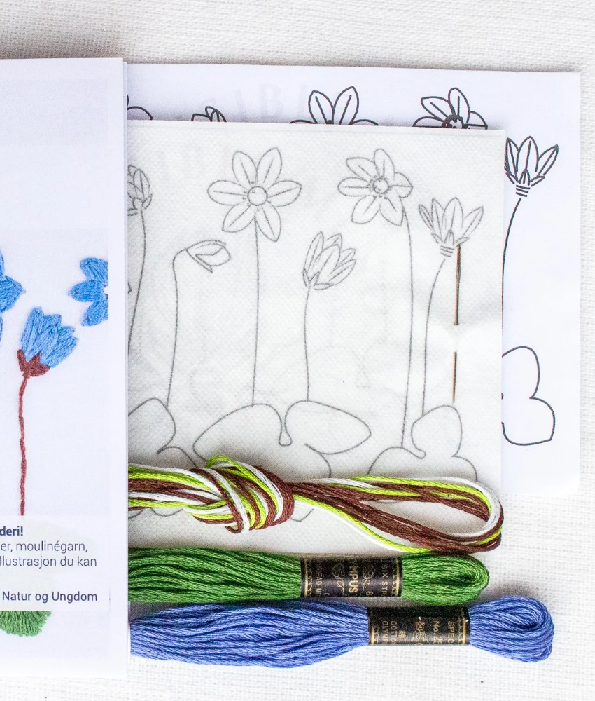 Broderisett med blåveis fra My Visible Mend. Med disse vannløselige mønstrene kan du enkelt komme i gang med broderi. Klipp ut ønsket motiv, fjern papiret på baksiden, fest det på plagget, broder og skyll bort arket med vann. Kun stingene dine blir igjen!