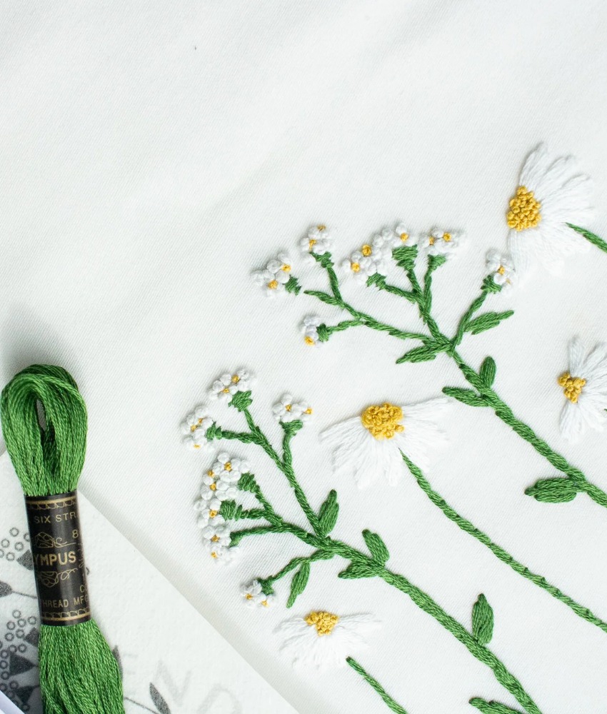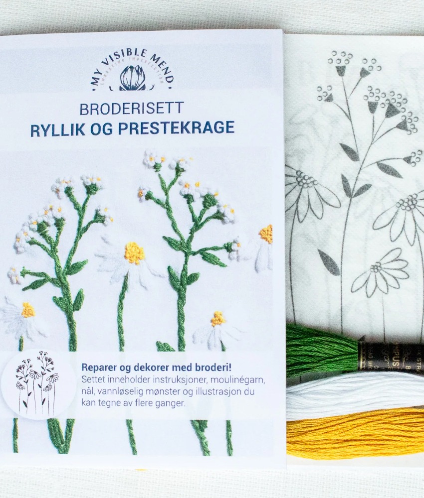 Broderisett med ryllik og prestekrage fra My Visible Mend. Med disse vannløselige mønstrene kan du enkelt komme i gang med broderi. Klipp ut ønsket motiv, fjern papiret på baksiden, fest det på plagget, broder og skyll bort arket med vann. Kun stingene dine blir igjen!